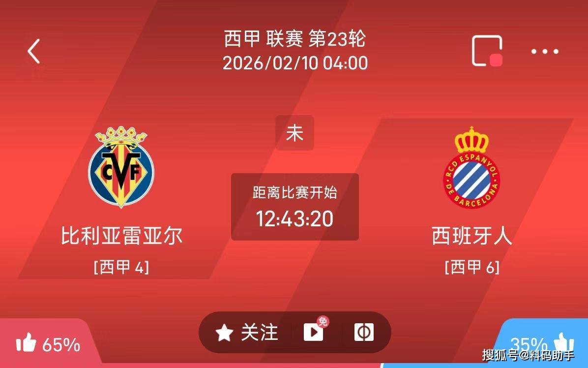今日足球推荐:2/9 4点西甲 比利亚雷亚尔VS西班牙人