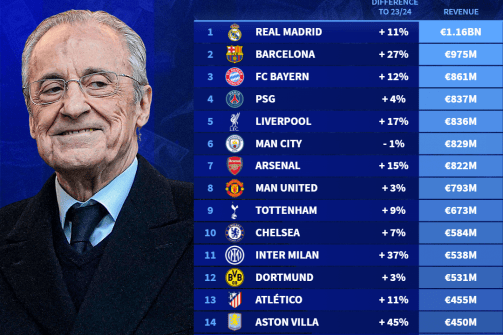 毫不令人感到意外的是,排名榜首的俱乐部是西甲的皇家马德里。该俱乐部在2023-24赛季成为了首家收入达到10亿欧的足球俱乐部,而在2024-25赛季,他们的收入更是接近了12亿欧。